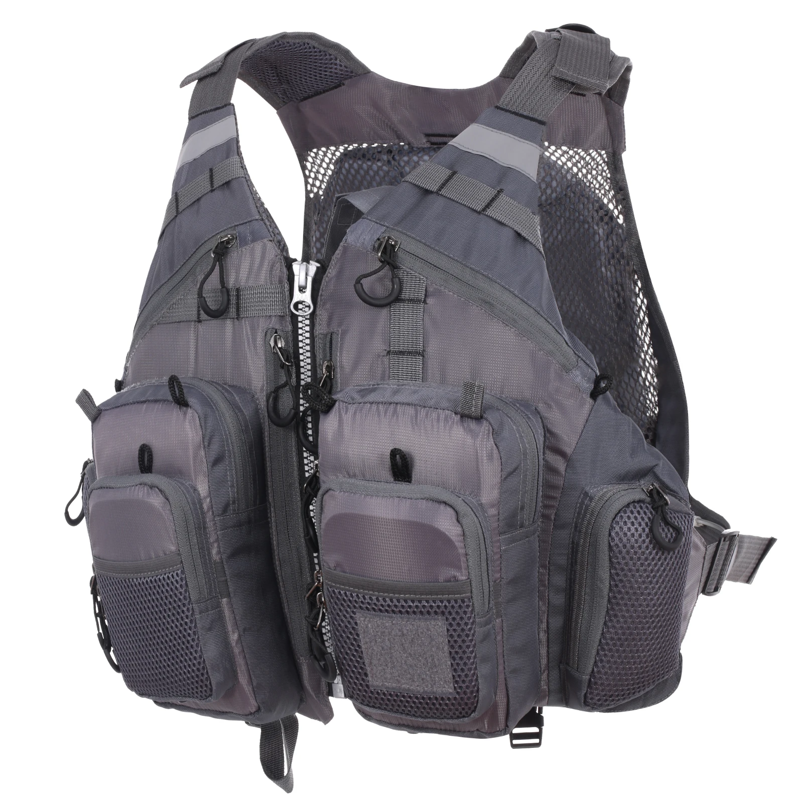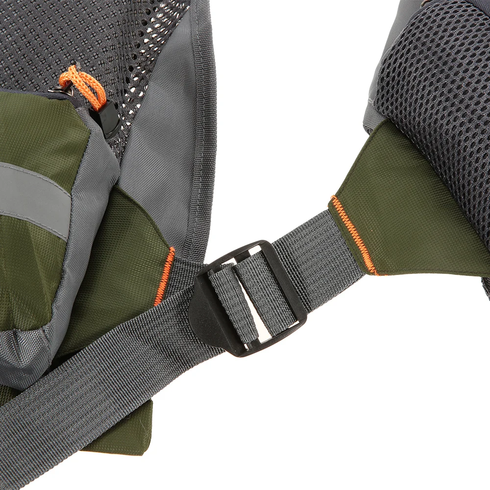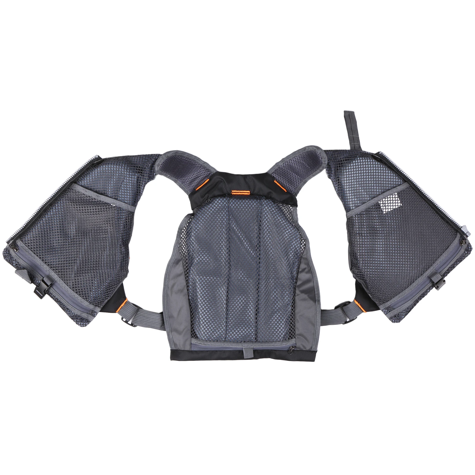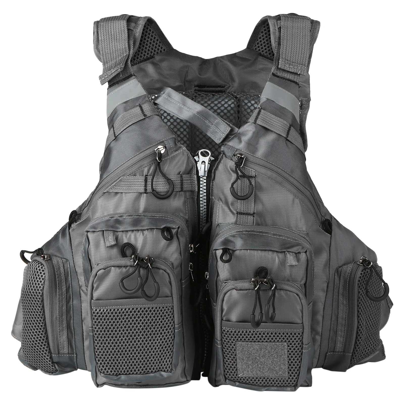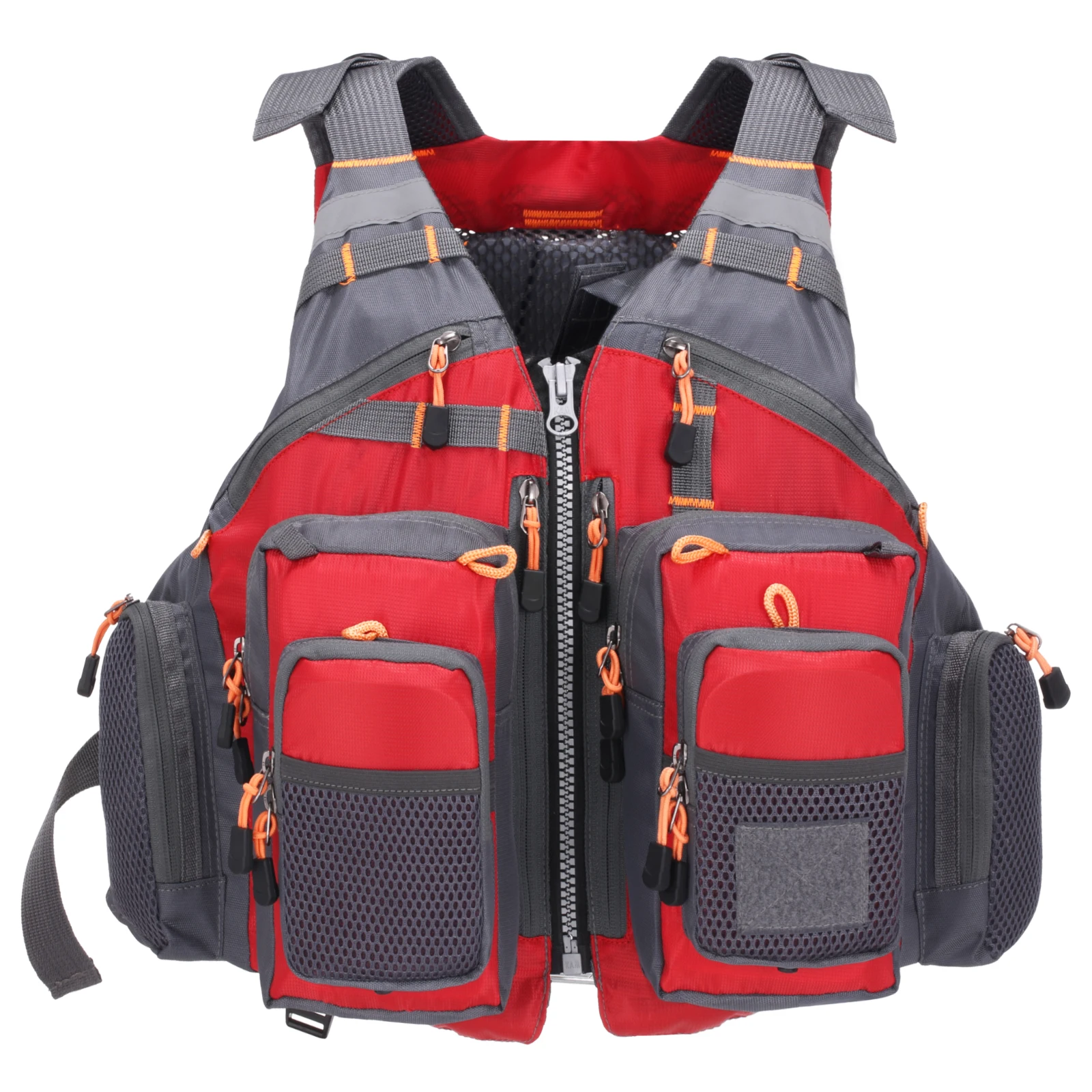 Este colete salva-vidas para pesca se assemelha mais a um colete para atividades ao ar livre, com um total de 11 bolsos com zíper, escadas multifixação e presilhas para acessórios na parte frontal, além de amplos refletores nas costas e no ombro. Por baixo, há um dispositivo de flutuação totalmente funcional, destacável para servir como suporte para equipamentos de pesca. Este colete serve em praticamente qualquer pessoa, graças às suas tiras de cinco informações com tela. Se sua principal prioridade é guardar equipamentos, este colete salva-vidas é único. É ótimo para pescar com mosca, caiaque, canoa (praticamente qualquer tipo de pesca).
