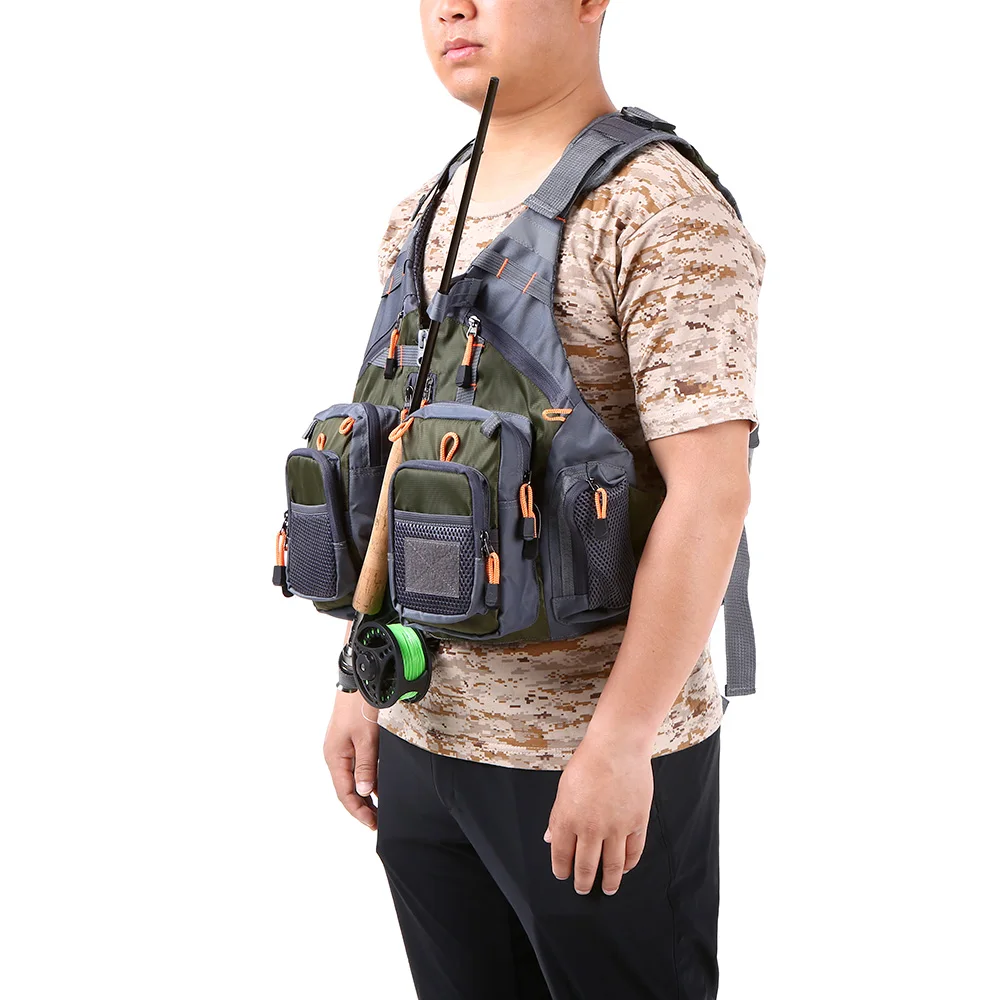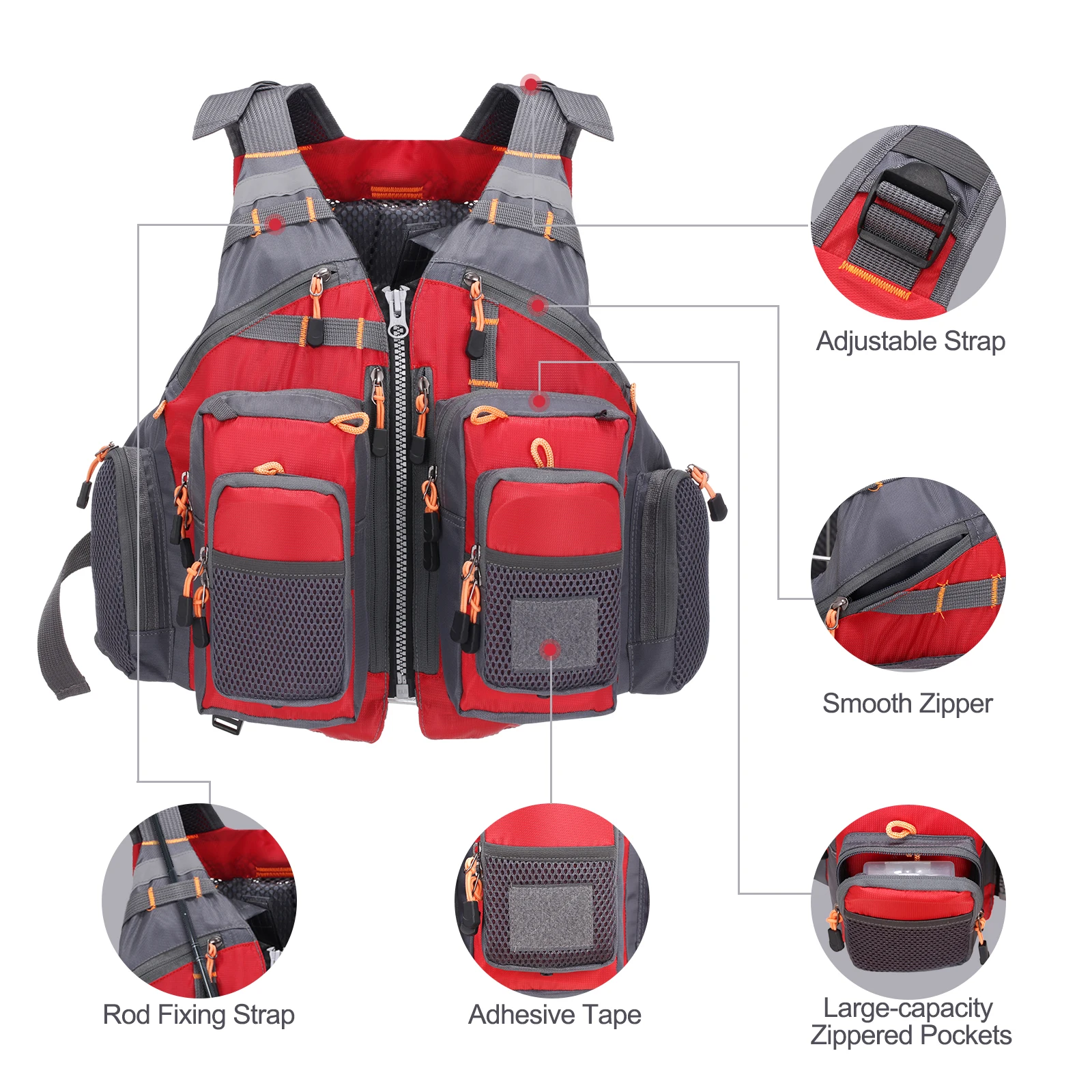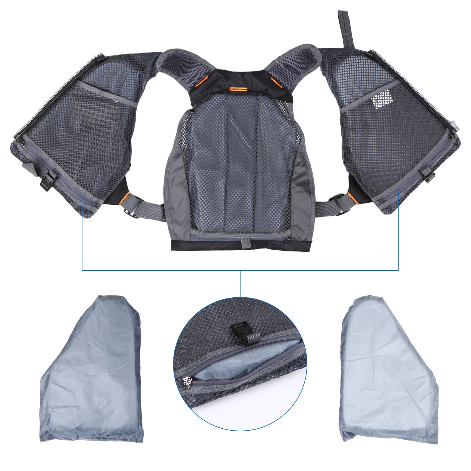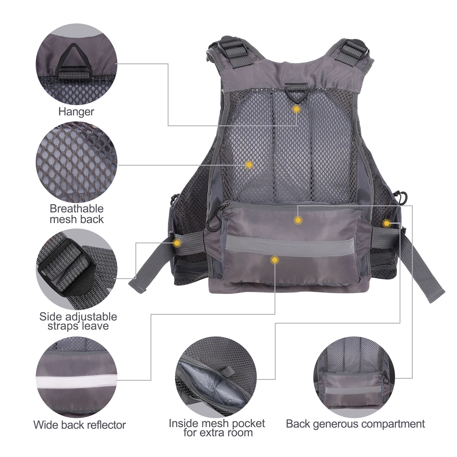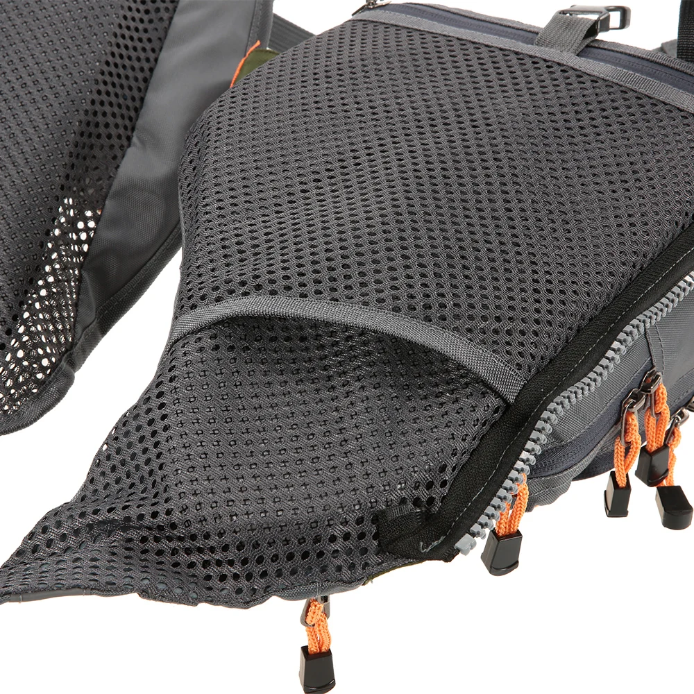 Este colete salva-vidas para pesca se assemelha mais a um colete para atividades ao ar livre, com um total de 11 bolsos com zíper, escadas multifixação e presilhas para acessórios na parte frontal, além de amplos refletores nas costas e no ombro. Por baixo, há um dispositivo de flutuação totalmente funcional, destacável para servir como suporte para equipamentos de pesca. Este colete serve em praticamente qualquer pessoa, graças às suas tiras de cinco informações com tela. Se sua principal prioridade é guardar equipamentos, este colete salva-vidas é único. É ótimo para pescar com mosca, caiaque, canoa (praticamente qualquer tipo de pesca).