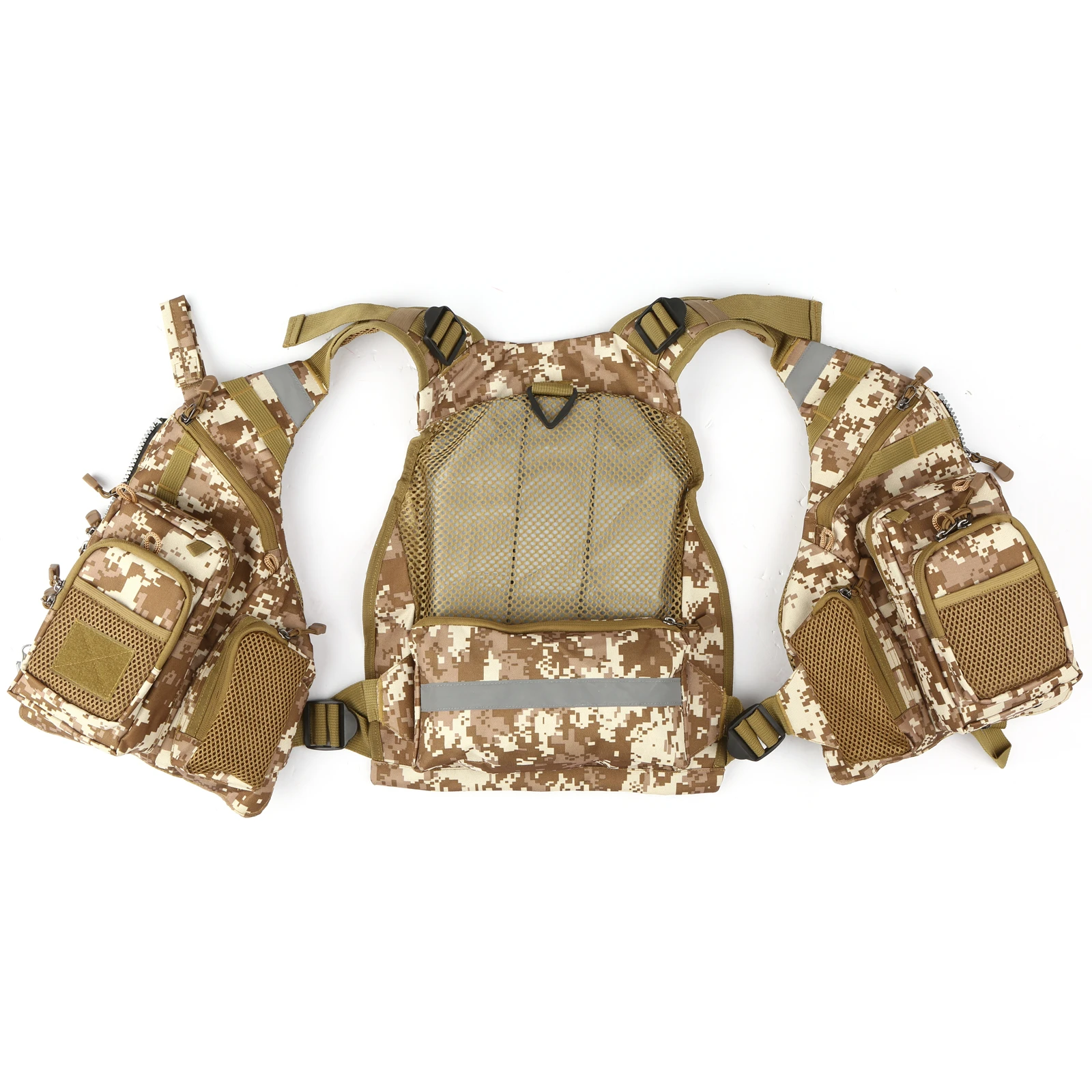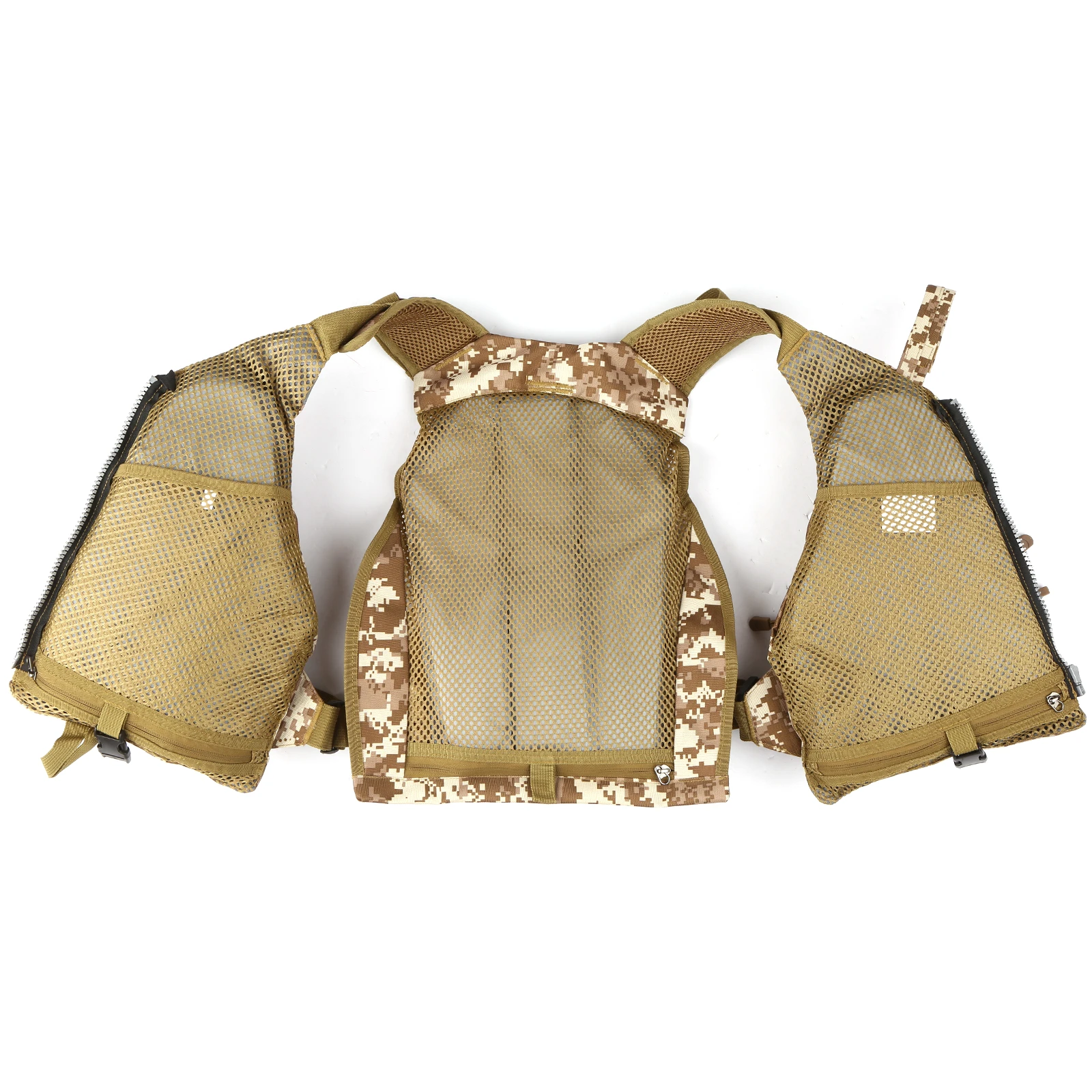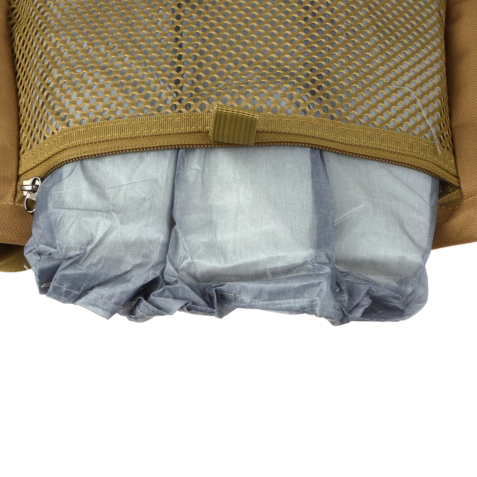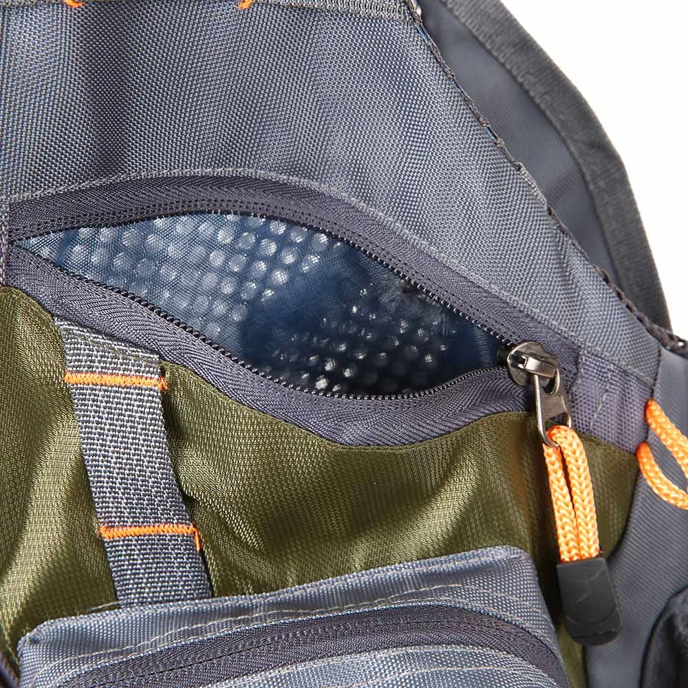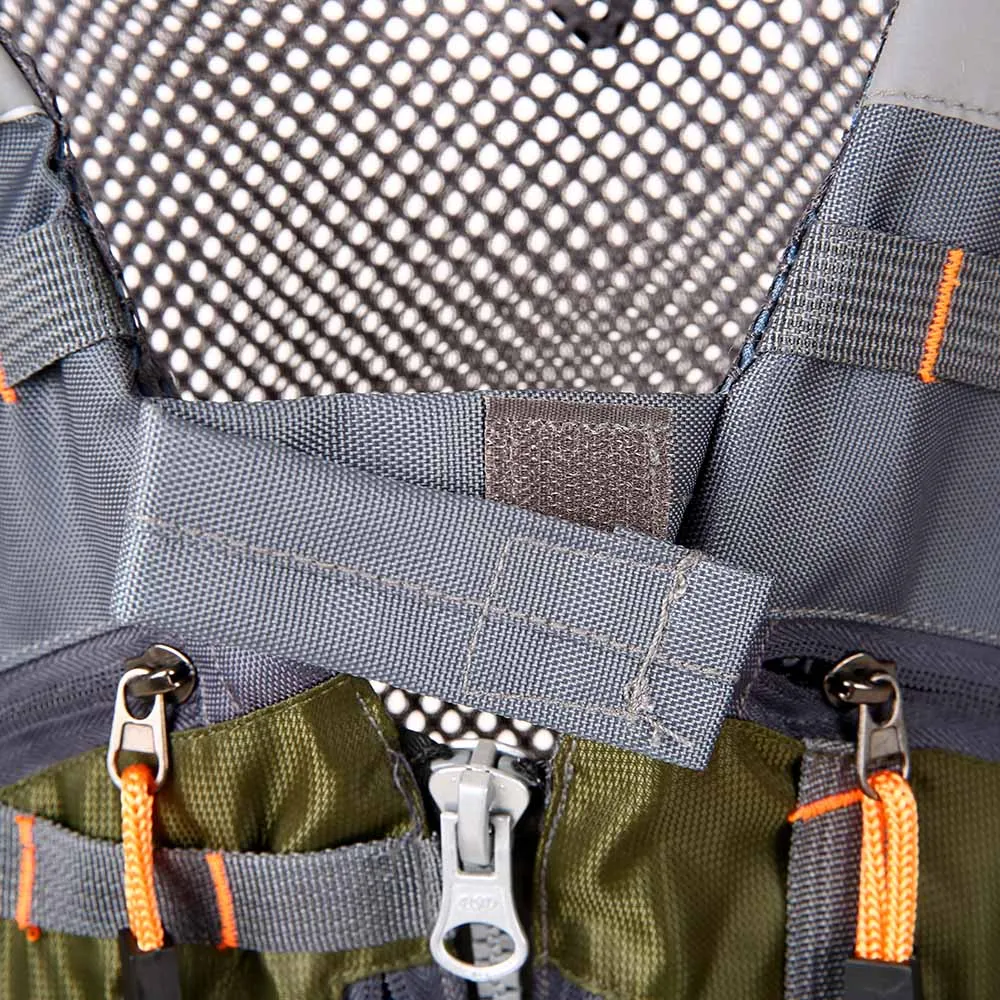 Quatro bolsos generosos no peito, quatro bolsos frontais com zíper, dois bolsos laterais de malha e um bolso generoso atrás no total.